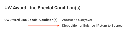 One of the Workday Award Line Special Conditions is Disposition of Balance | Return to Sponsor. To see this field, go to the Award Lines Overview under Award Lines and click on the magnifying glass icon under the Contract Line column. Special Conditions are in the Additional Data section.