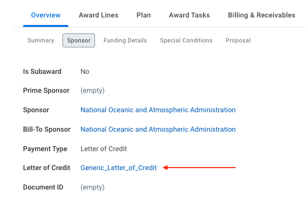 The sponsor reimbursement method is Letter of Credit. This is similar to Cost Reimbursable and any cash surpluses must be refunded. This field is in the Sponsor tab under Overview.