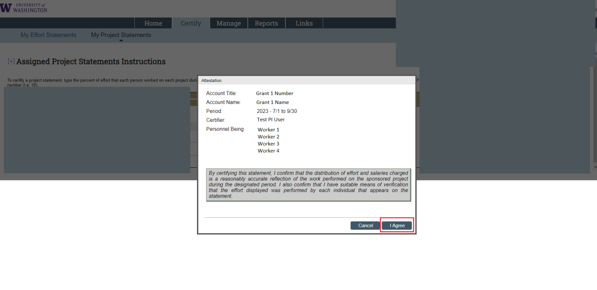 - If you clicked “I Agree”, the statement you selected is now certified. You will be taken to the next report ready for certification if you have one (The screen will look very similar to before, but it will likely be showing a statement for a separate grant work tag). As of now, the only way to see statements you have certified is to search for the grant number (e.g. GR000001) in the main search bar at the top of the application.