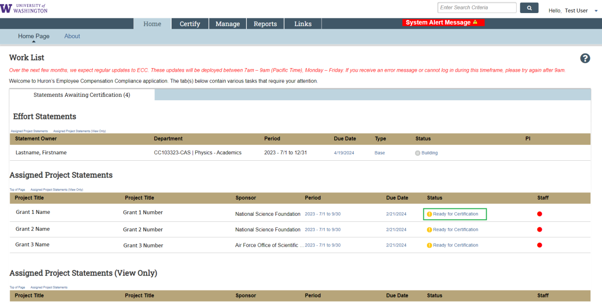 - After you login, you will land on the Home Page of ECC on a tab called “Statements Awaiting Certification”