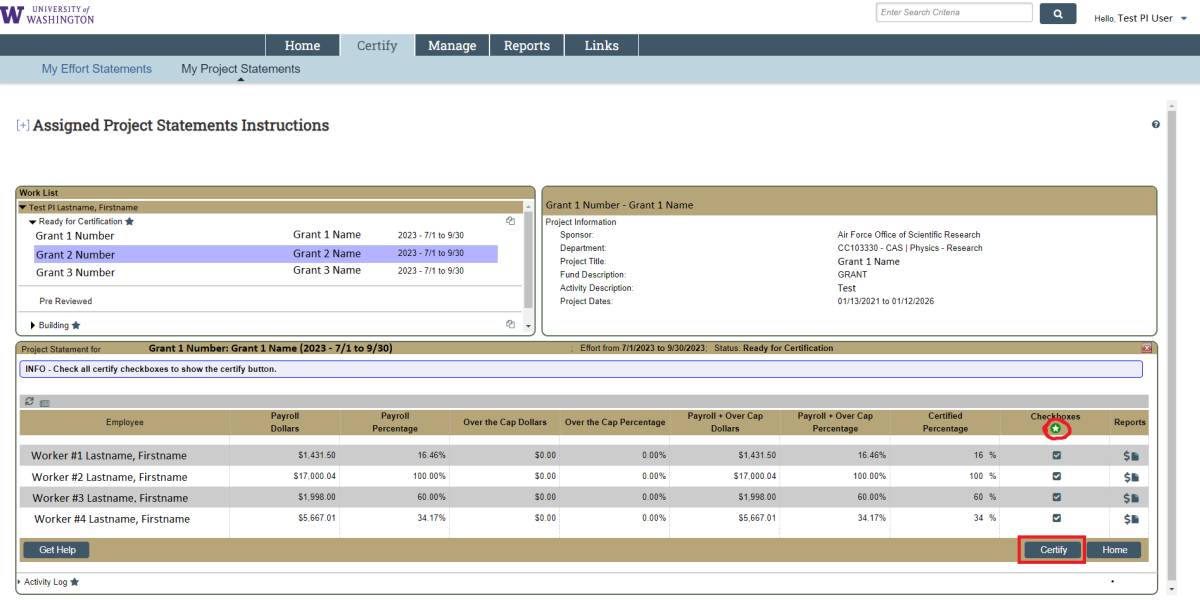 After you have reviewed the salary charges and effort distributions, check the boxes in the “Certify” column (Red arrows). Use the green circle with a white star icon under the “Certify” column header (circled in red above checkboxes), to check all the boxes at once.