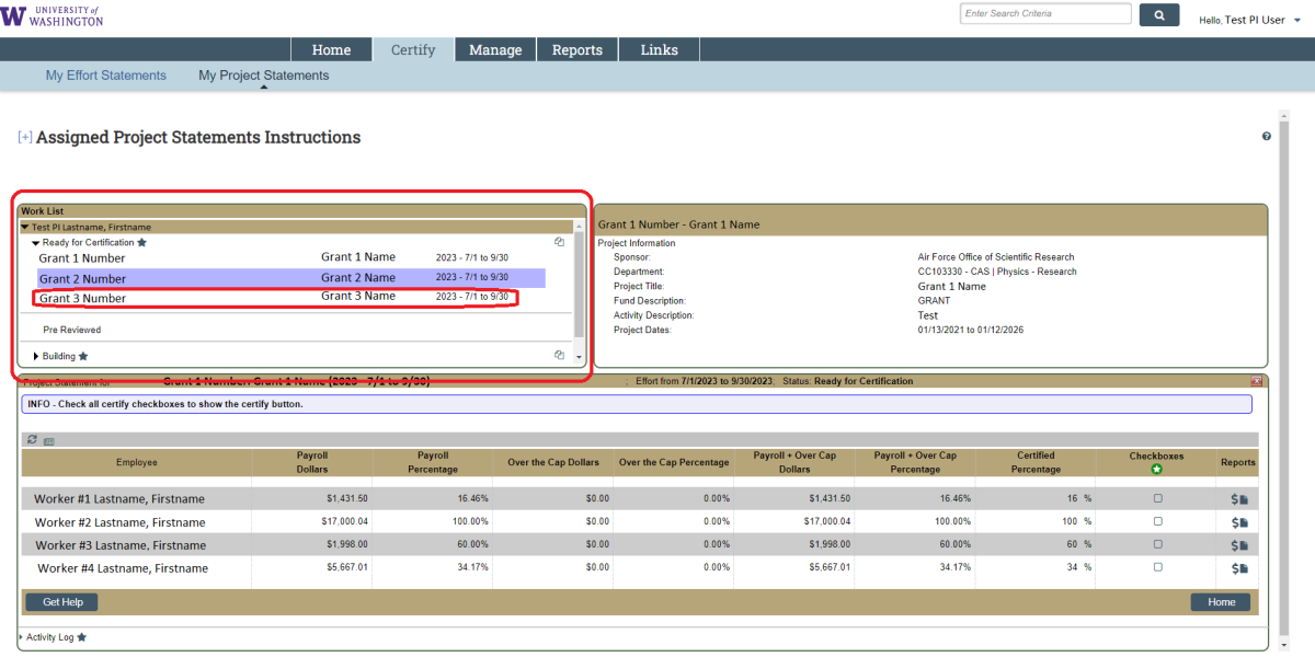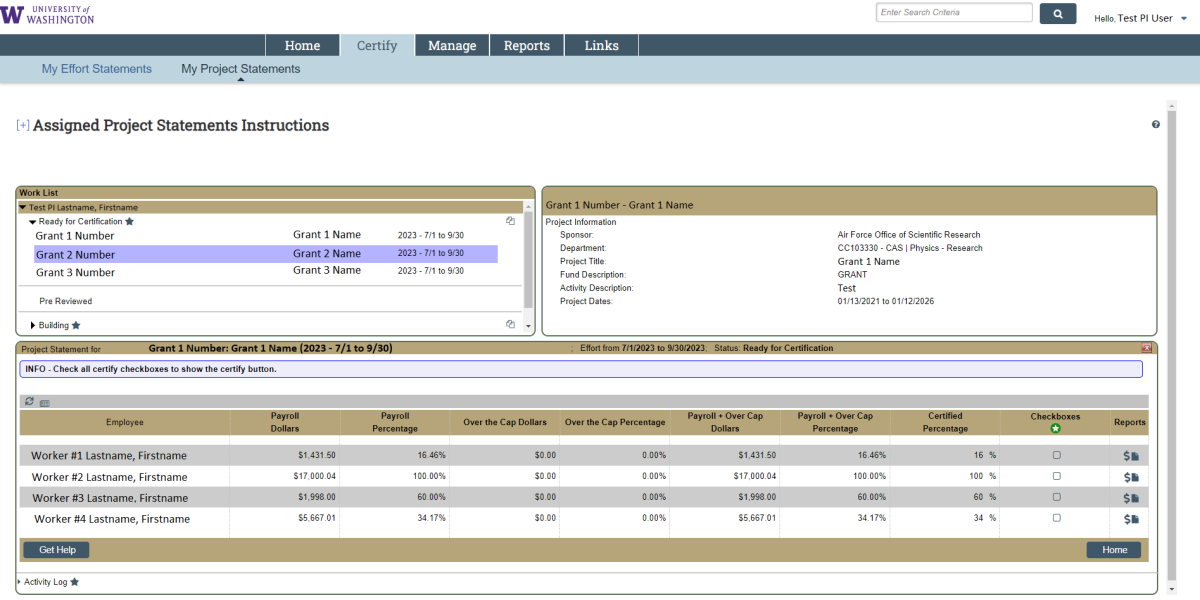 General Info: Project statements are the post-FT equivalent of the Grant and Contract Certification reports (GCCRs). They are quarterly statements that show the staff salaries charged to a particular grant. There is one project statement per grant work tag (grant number) and the statements require certification by the PI of the grant.